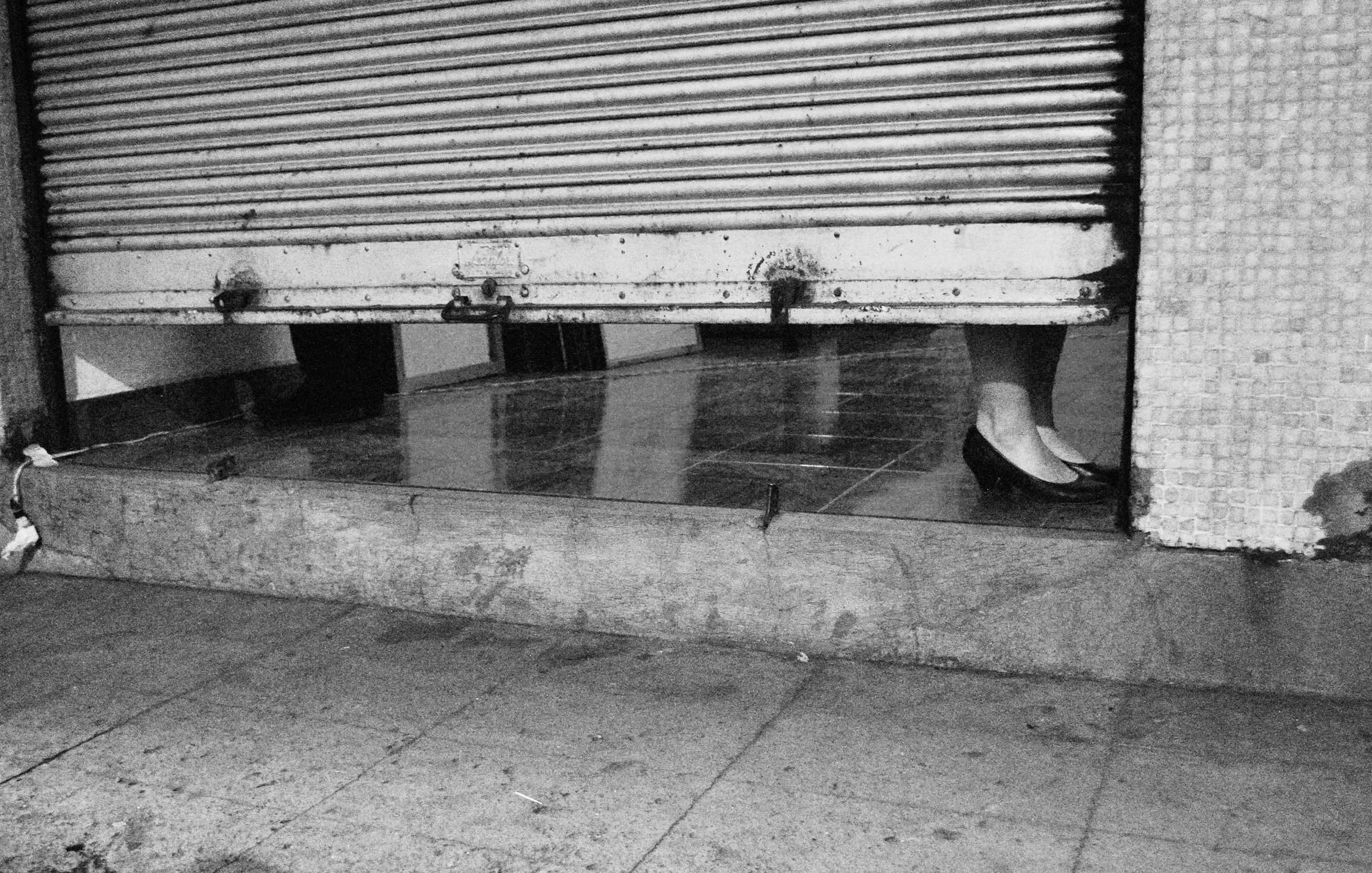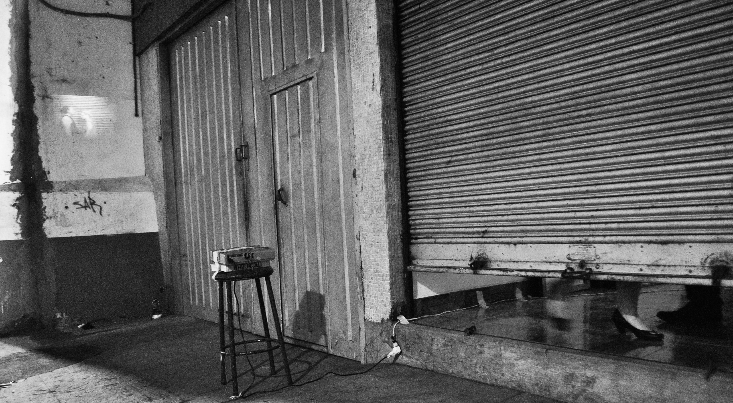 La propuesta se genera a partir del gesto de caminar y tocarse en un punto en el que confluyen los cuerpos de los artistas. El gesto se repite en frente de una cámara de vigilancia. La proyección se visualiza en el exterior del lugar donde se realiza la acción, en una pared del barrio. De tal modo que el público pueda ver la propuesta por medio del dispositivo tecnológico y por el espacio visible que intencionalmente ha quedado abierta, permitiendo ver solamente los pies de los artistas.