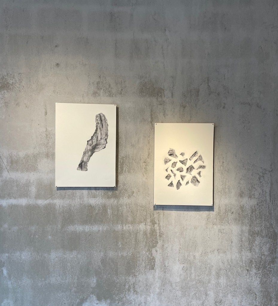Dos dibujos que representan al tronco y cortezas del árbol conocido localmente como Quishuar, originario de la región andina. Realizado a través de la técnica del transfer y retocado con carboncillo para obtener una cercanía a su forma y textura, recordando la ilustración botánica y su fin didáctico artístico.