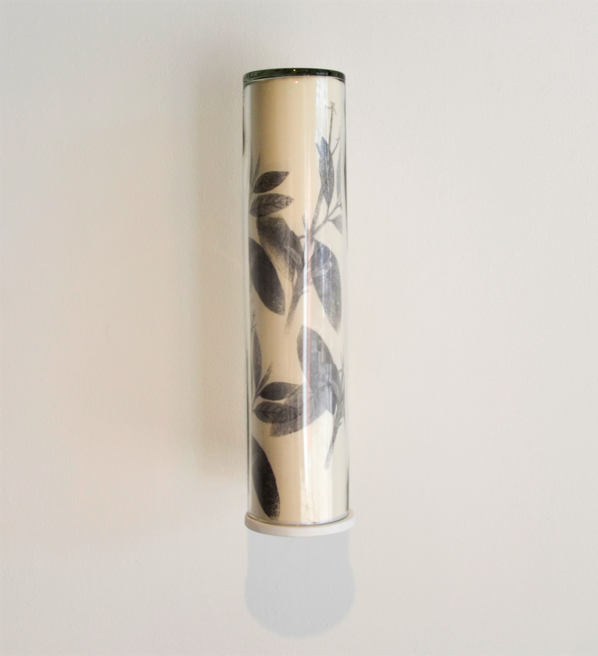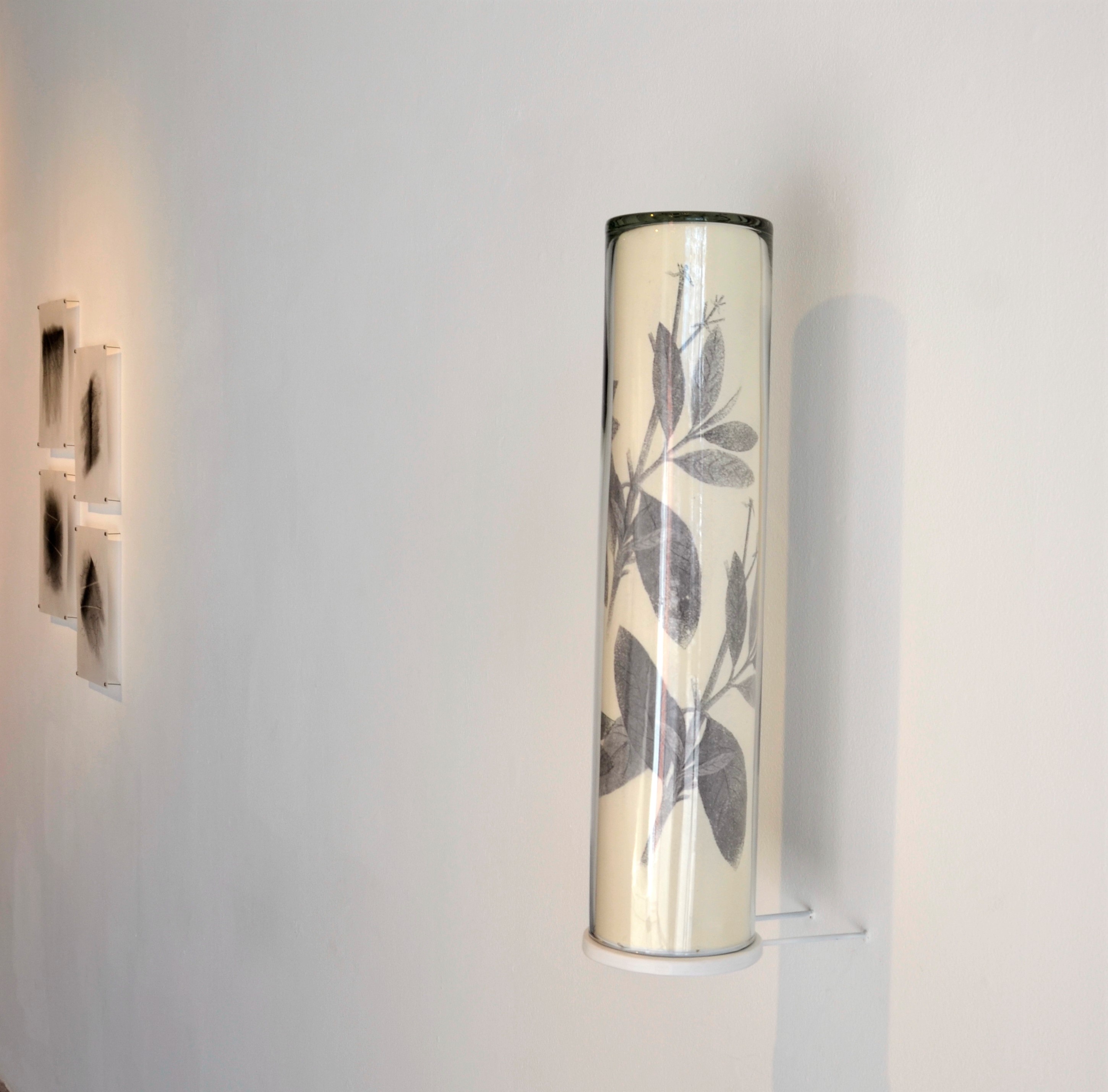 Medio: transfer y carboncillo sobre papel de algodón, cilindro de vidrio, madera