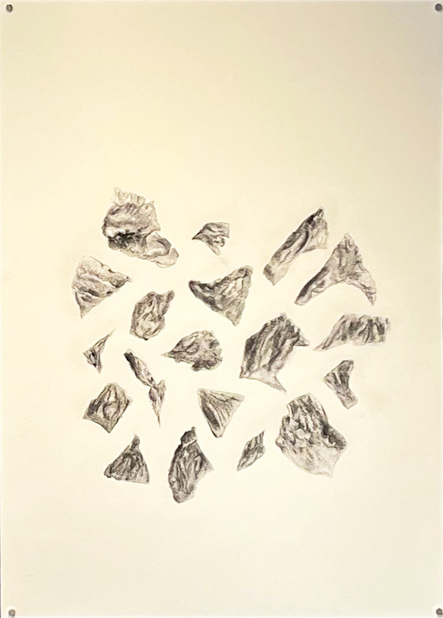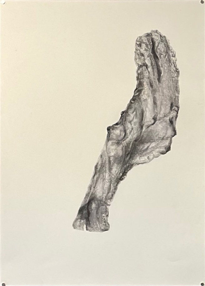 Dos dibujos que representan al tronco y cortezas del árbol conocido localmente como Quishuar, originario de la región andina. Realizado a través de la técnica del transfer y retocado con carboncillo para obtener una cercanía a su forma y textura, recordando la ilustración botánica y su fin didáctico artístico.