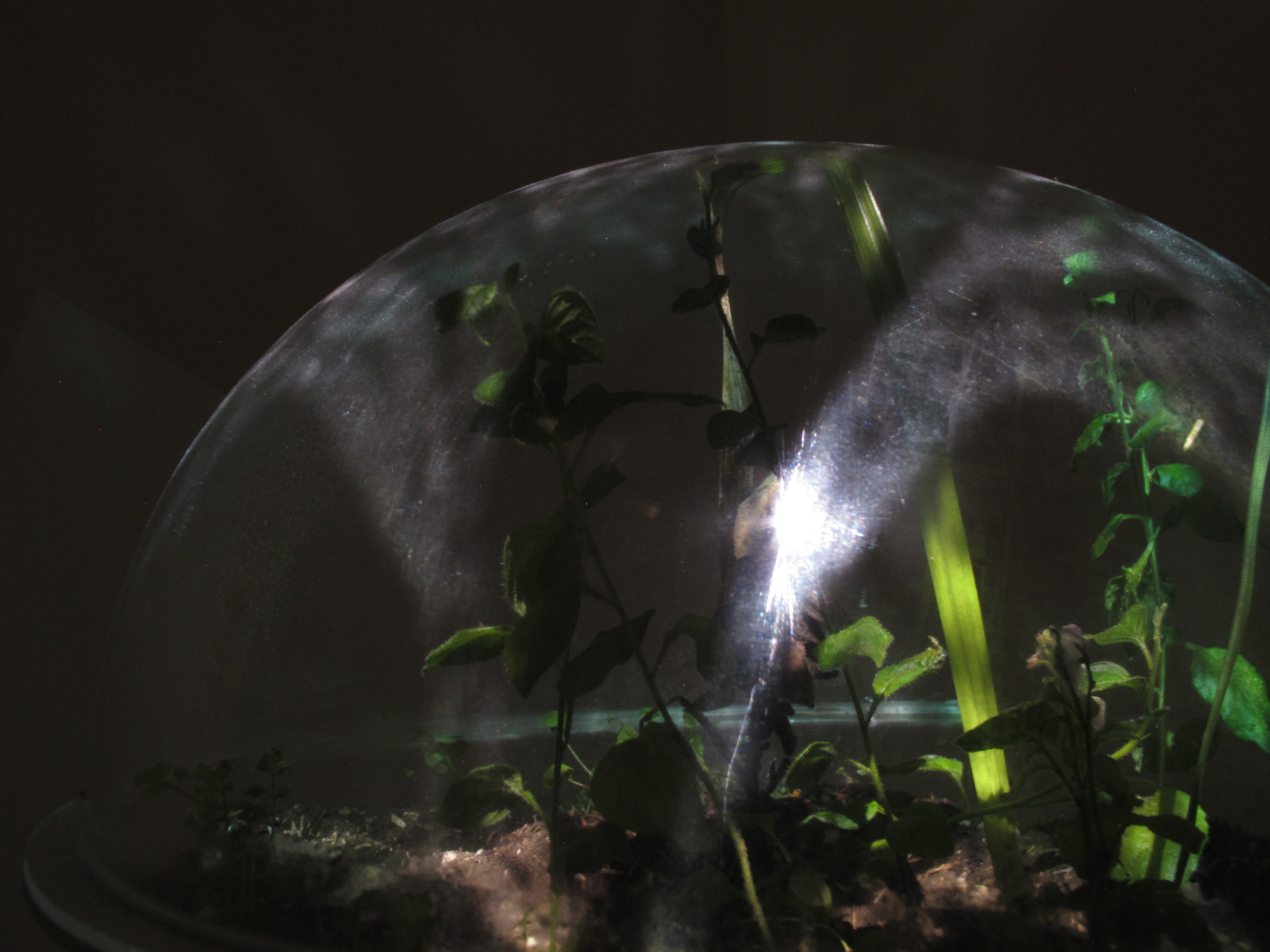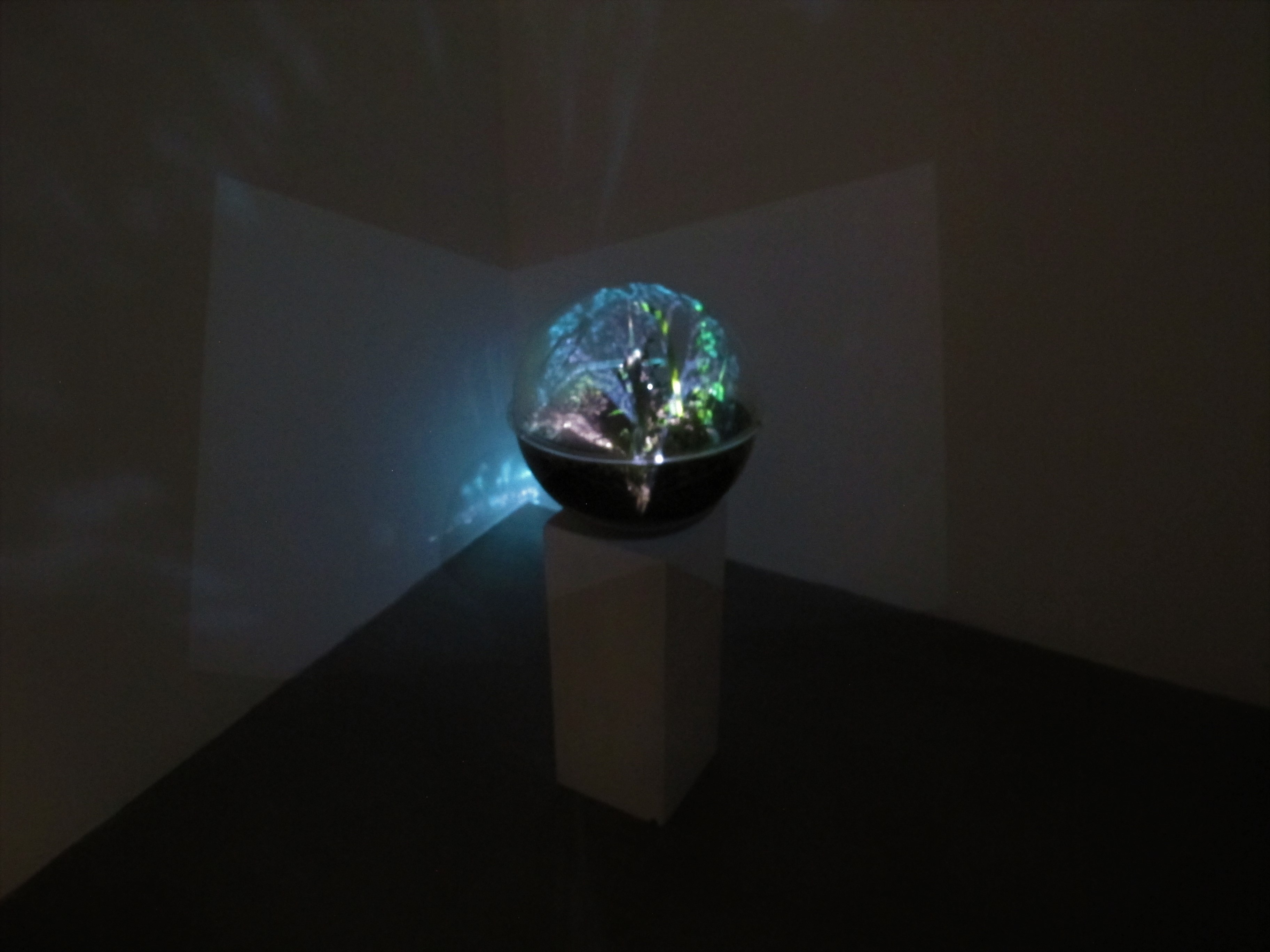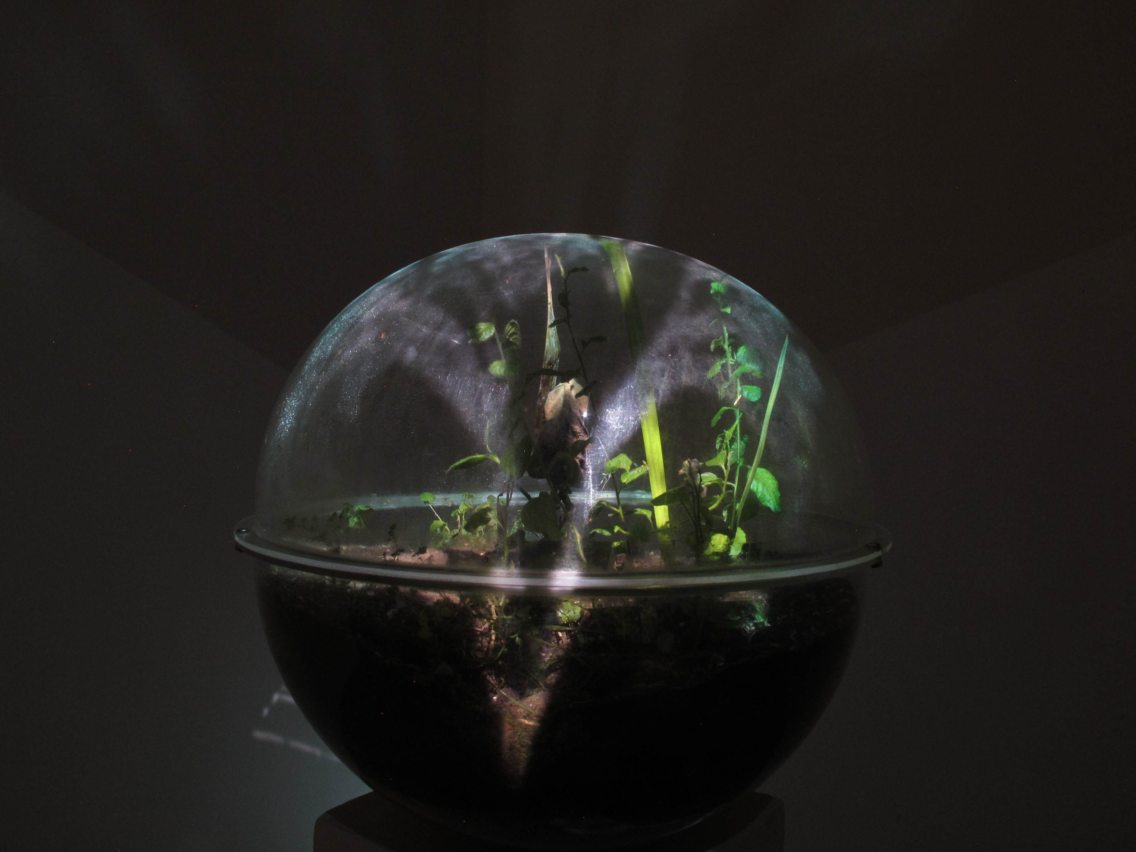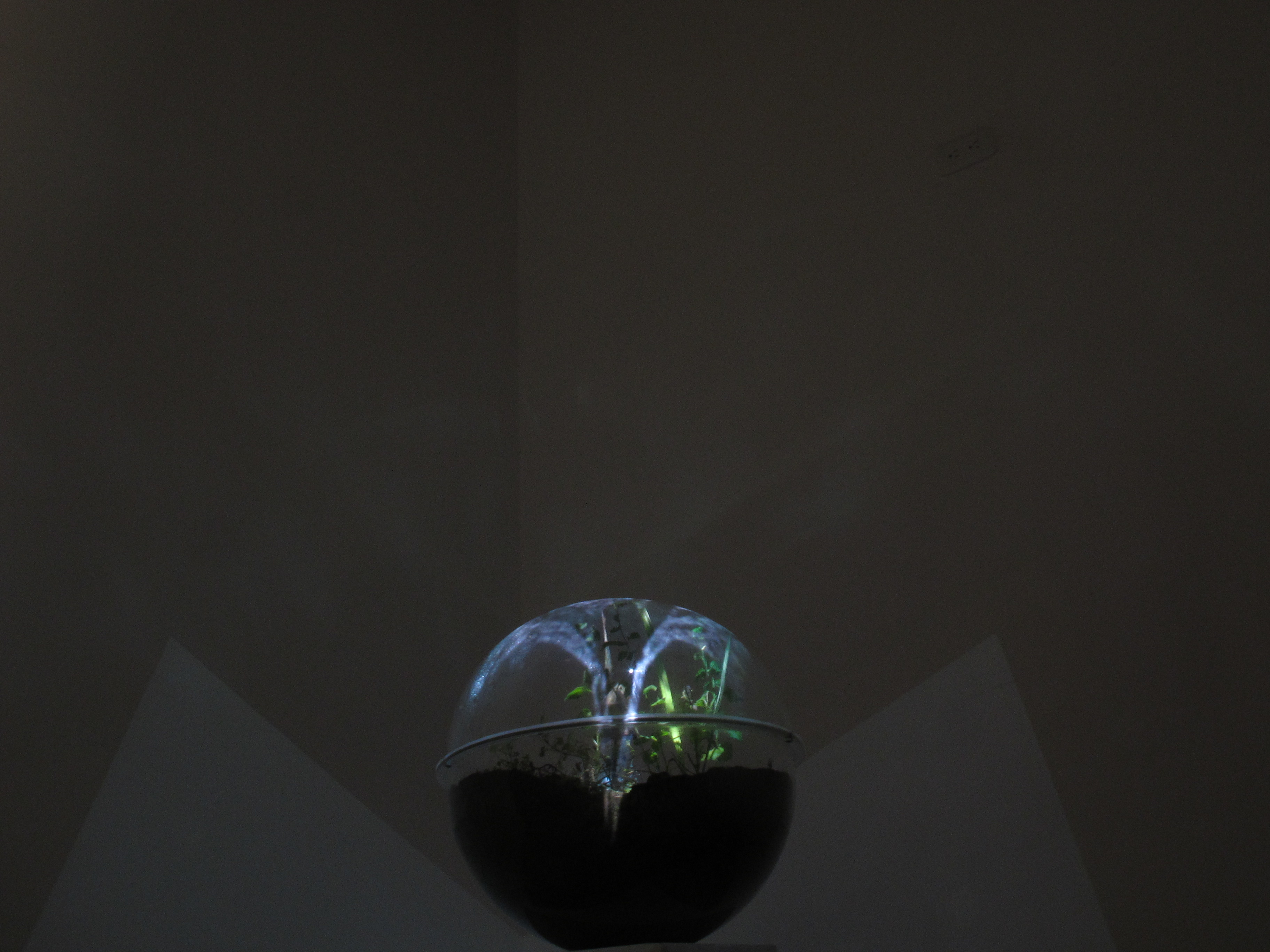 Medio: Video mapping sobre esfera conteniendo tierra, mala hierba y una planta de Buddleja Incana (Quishuar).